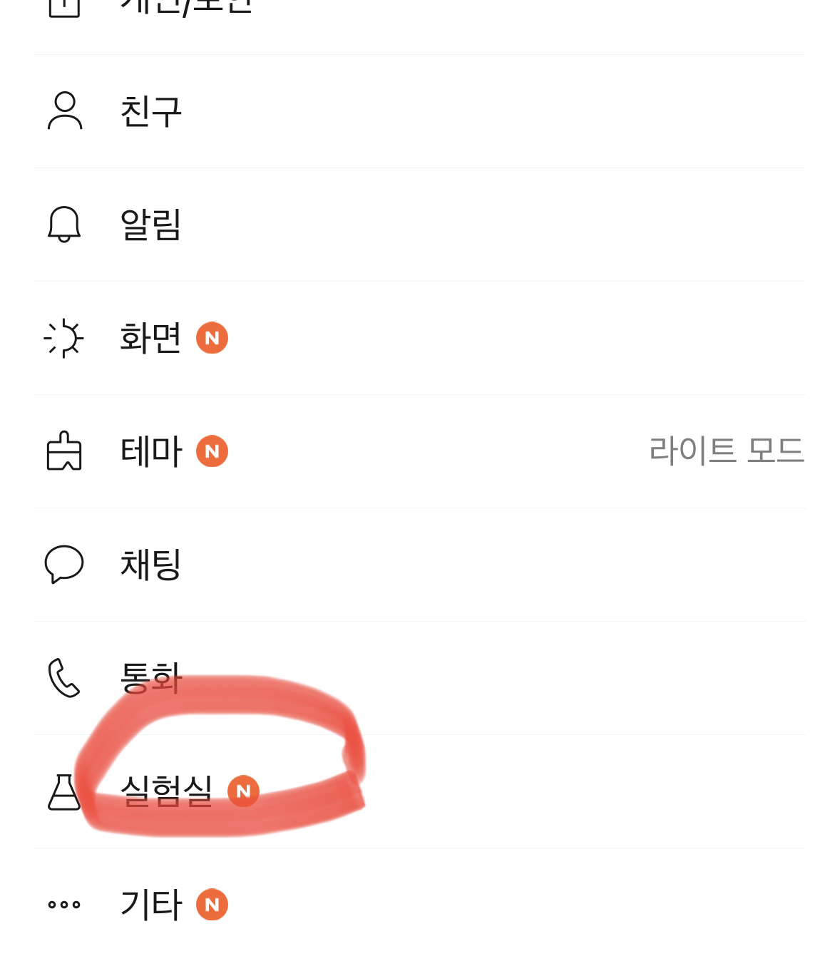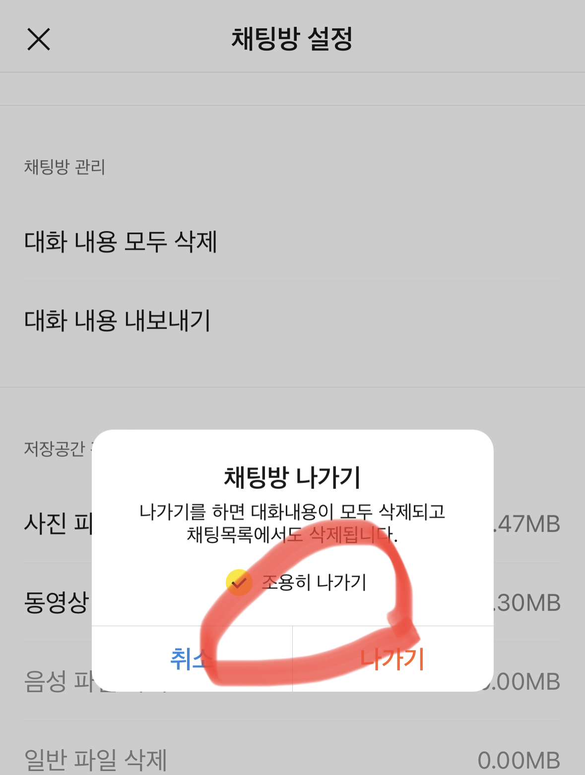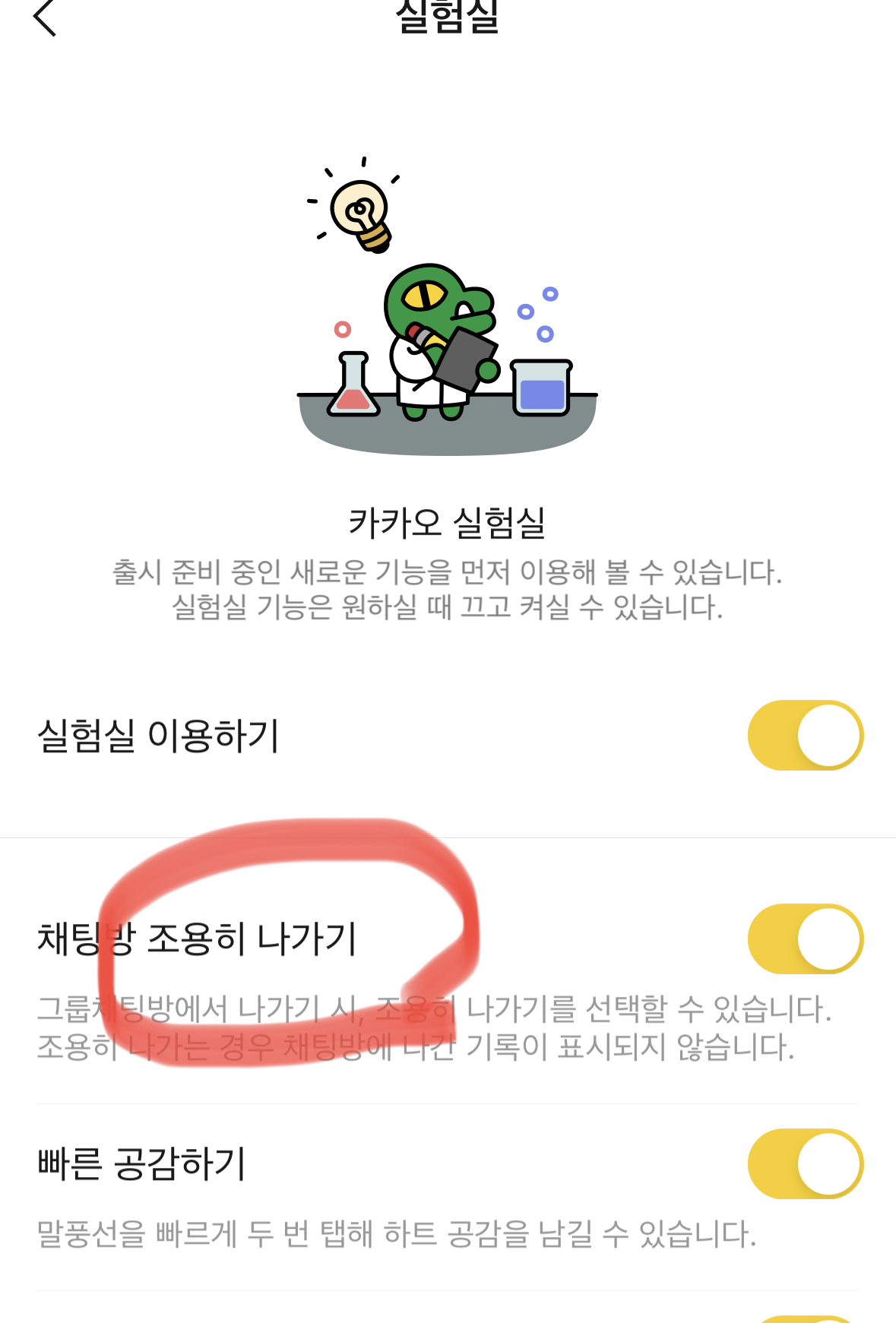 최신 버전으로 업데이트한 카카오톡을 열고 설정메뉴를 들어갑니다 실험실이라는 메뉴가 있어서 터치하시면 '채팅방 조용히 나가기' 란 옵션이 있습니다 선택하시면 되고요